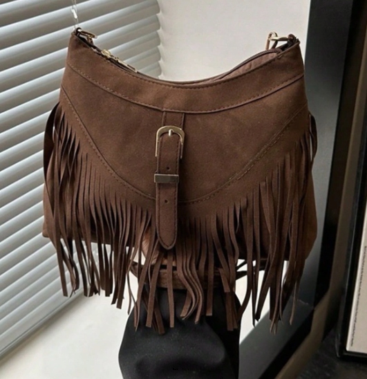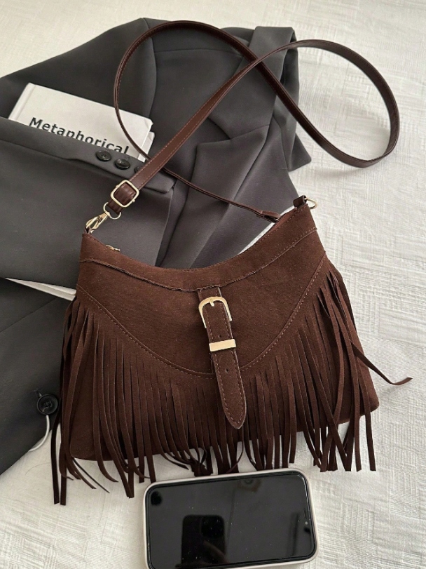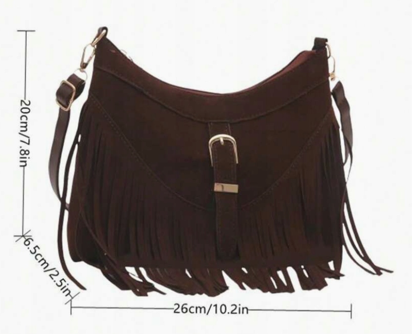 ✴️ TOREBKA DAMSKA CIEMNO BRĄZOWA ZAMSZOWA FRĘDZLE MAŁA NA PASKU SKÓRA EKO D06
