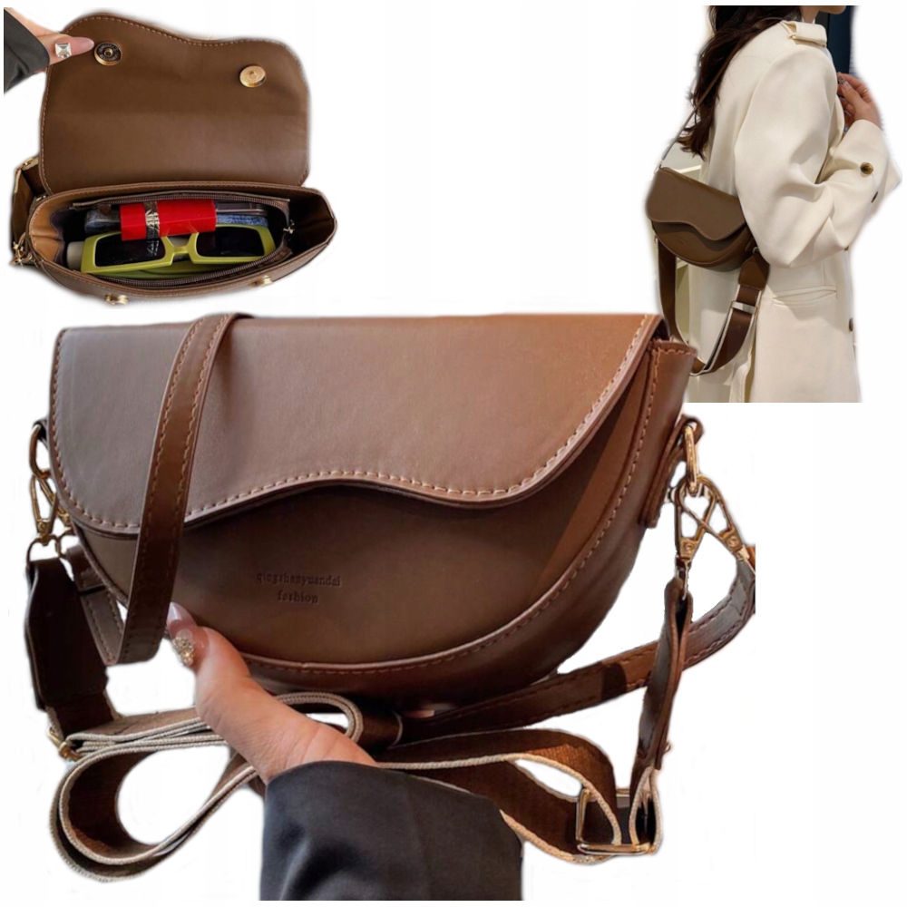 ✴️ TOREBKA DAMSKA LISTONOSZKA CIEMNO BRĄZOWA SKÓRZANA NA RAMIĘ DWA PASKI D10