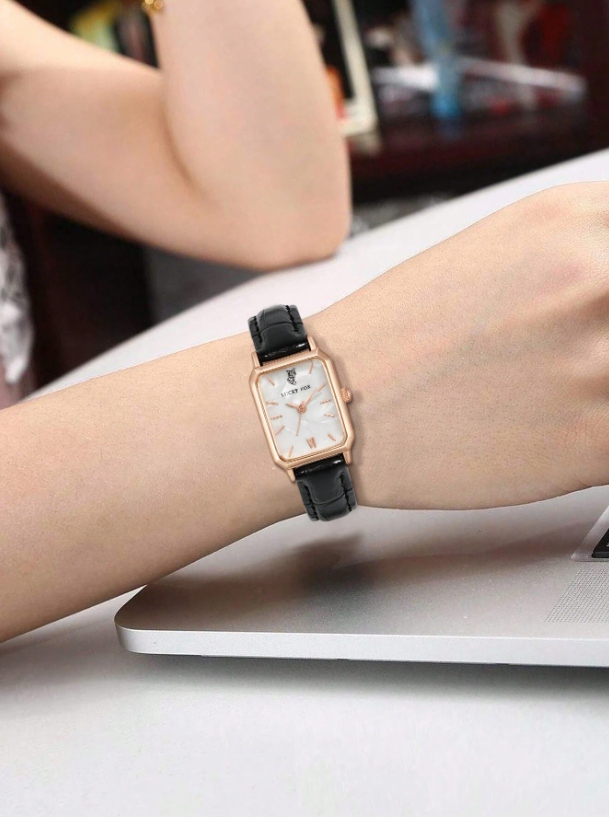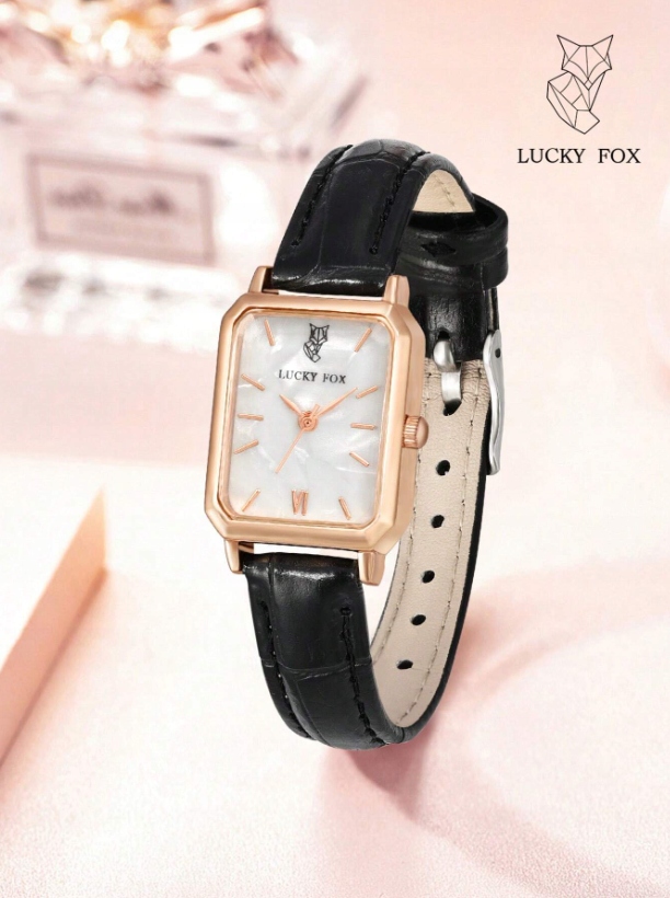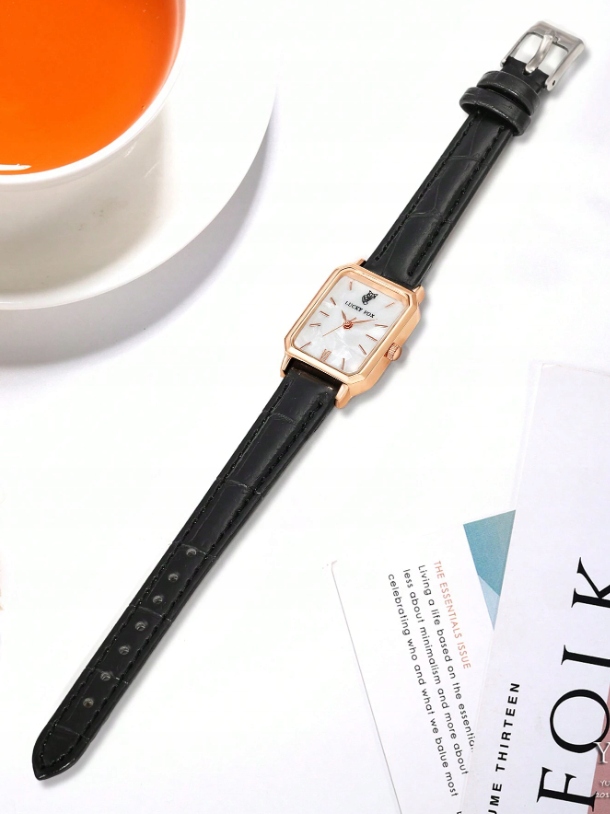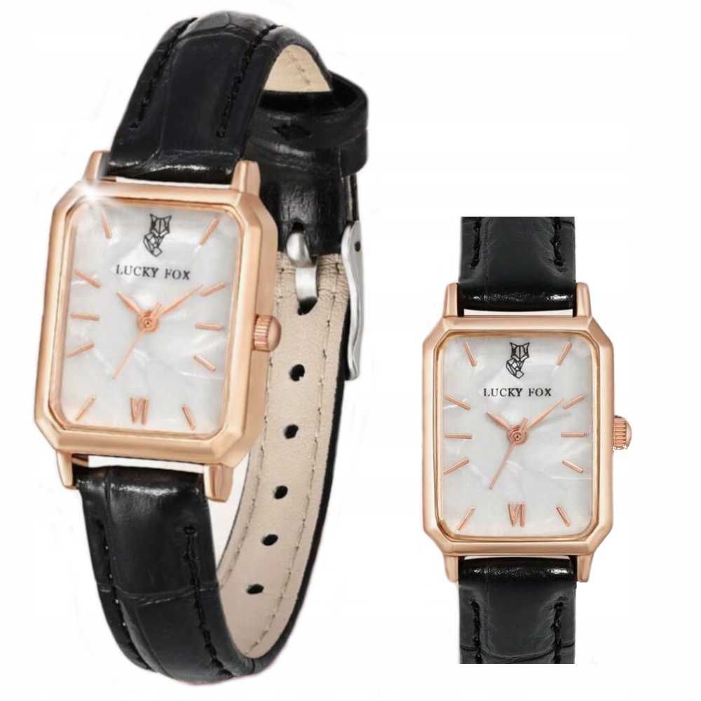 ✴️ ZEGAREK DAMSKI CZARNY PASEK SKÓRZANY PROSTOKĄTNA TARCZA LUCKYFOX DLA NIEJ