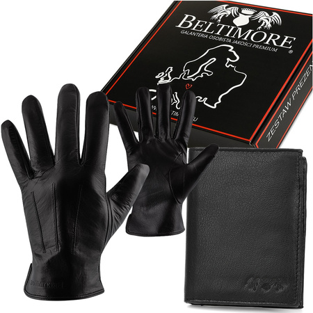 - Zestaw męski Beltimore T83 to elegancki komplet w czarnym kolorze składający się z pionowego portfela i skórzanych rękawiczek w rozmiarze L/XL. Wykonany z naturalnej skóry zapakowany w estetyczne pudełko prezentowe.